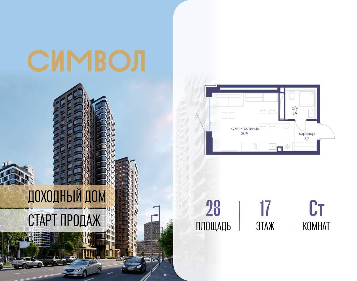 Продается квартира-студия от застройщика: общая площадь 28.00 м, жилая 15.90 м, кухня 5.00 м, 17-й этаж, жилой квартал «Гордость», корпус 40 (секция 1) . Срок сдачи: 2 квартал 2029 года.