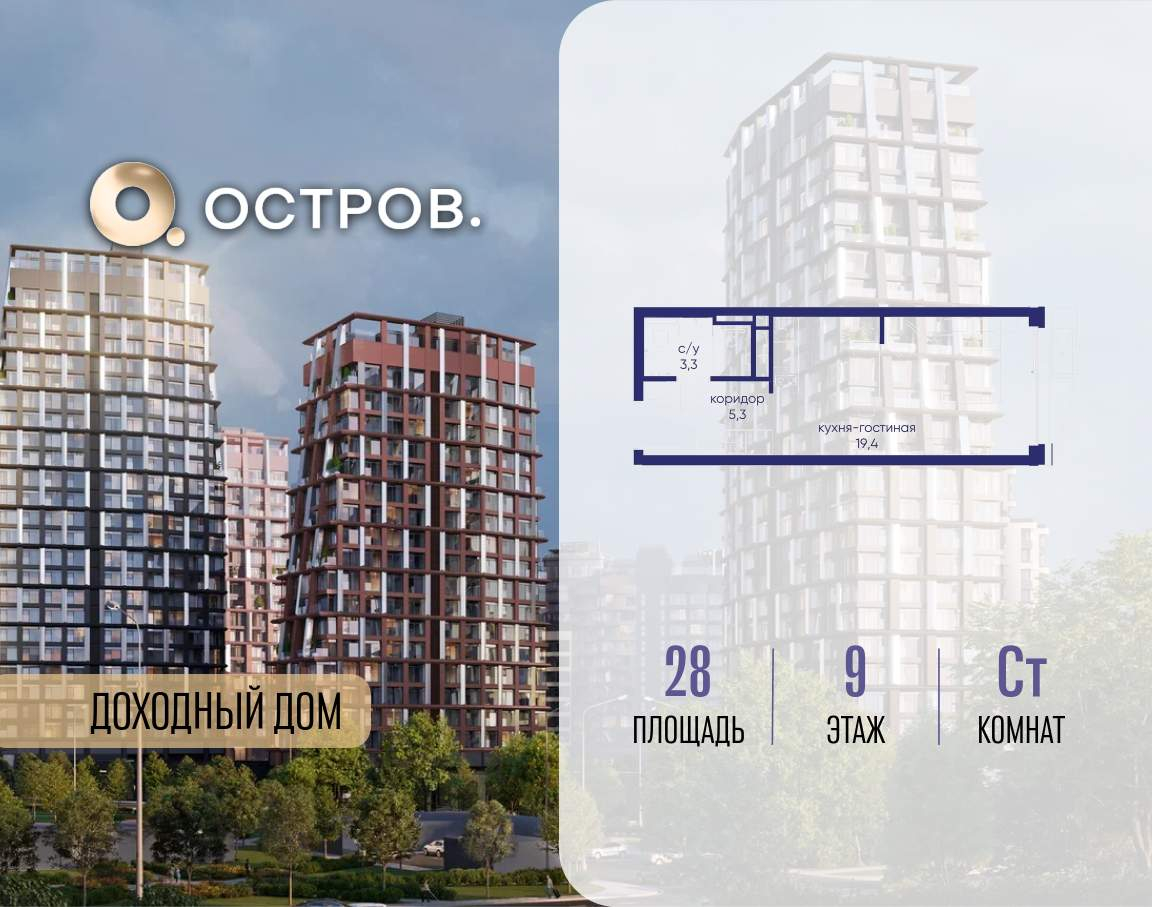 Продаётся квартира от застройщика: общая площадь 28.00 м, жилая 14.40 м, кухня 5.00 м, 9-й этаж, жилой квартал «Остров 14», корпус 1 (секция 2) . Срок сдачи: 2 квартал 2029 года.