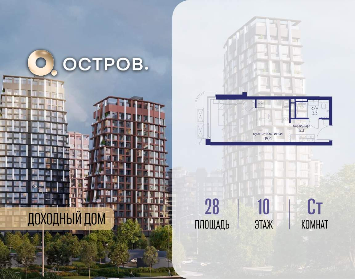 Продаётся квартира от застройщика: общая площадь 28.00 м, жилая 14.40 м, кухня 5.00 м, 10-й этаж, жилой квартал «Остров 14», корпус 1 (секция 2) . Срок сдачи: 2 квартал 2029 года.
