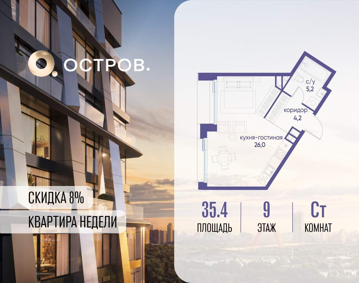 Продаётся квартира от застройщика: общая площадь 35.40 м, жилая 20.00 м, кухня 6.00 м, 9-й этаж, жилой квартал «Остров 12», корпус 1 (секция 1) . Срок сдачи: 1 квартал 2029 года.