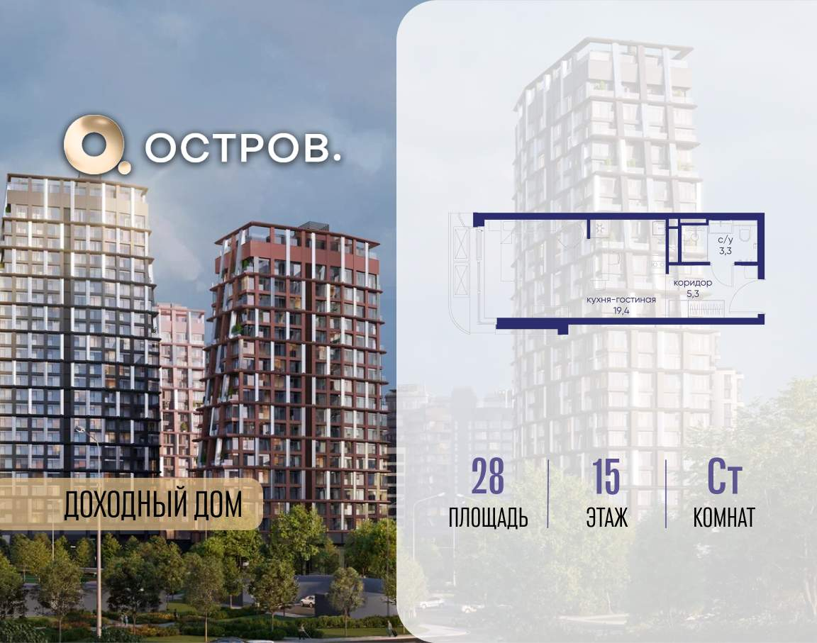 Продаётся квартира от застройщика: общая площадь 28.00 м, жилая 14.00 м, кухня 5.00 м, 15-й этаж, жилой квартал «Остров 14», корпус 1 (секция 2) . Срок сдачи: 2 квартал 2029 года.
