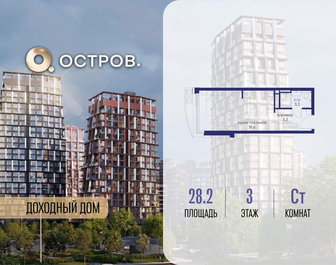 Продаётся квартира от застройщика: общая площадь 28.20 м, жилая 14.60 м, кухня 5.00 м, 3-й этаж, жилой квартал «Остров 14», корпус 1 (секция 1) . Срок сдачи: 2 квартал 2029 года.