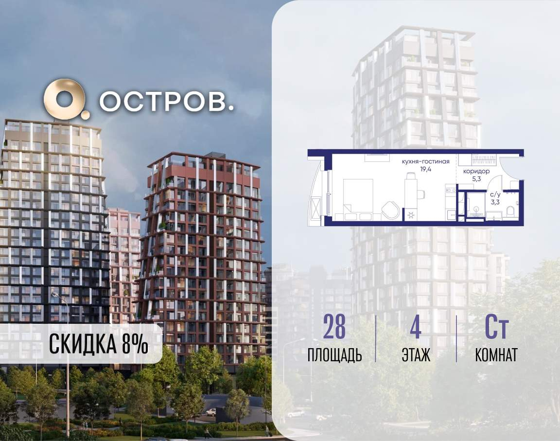 Продаётся квартира от застройщика: общая площадь 28.00 м, жилая 14.40 м, кухня 5.00 м, 4-й этаж, жилой квартал «Остров 14», корпус 1 (секция 1) . Срок сдачи: 2 квартал 2029 года.