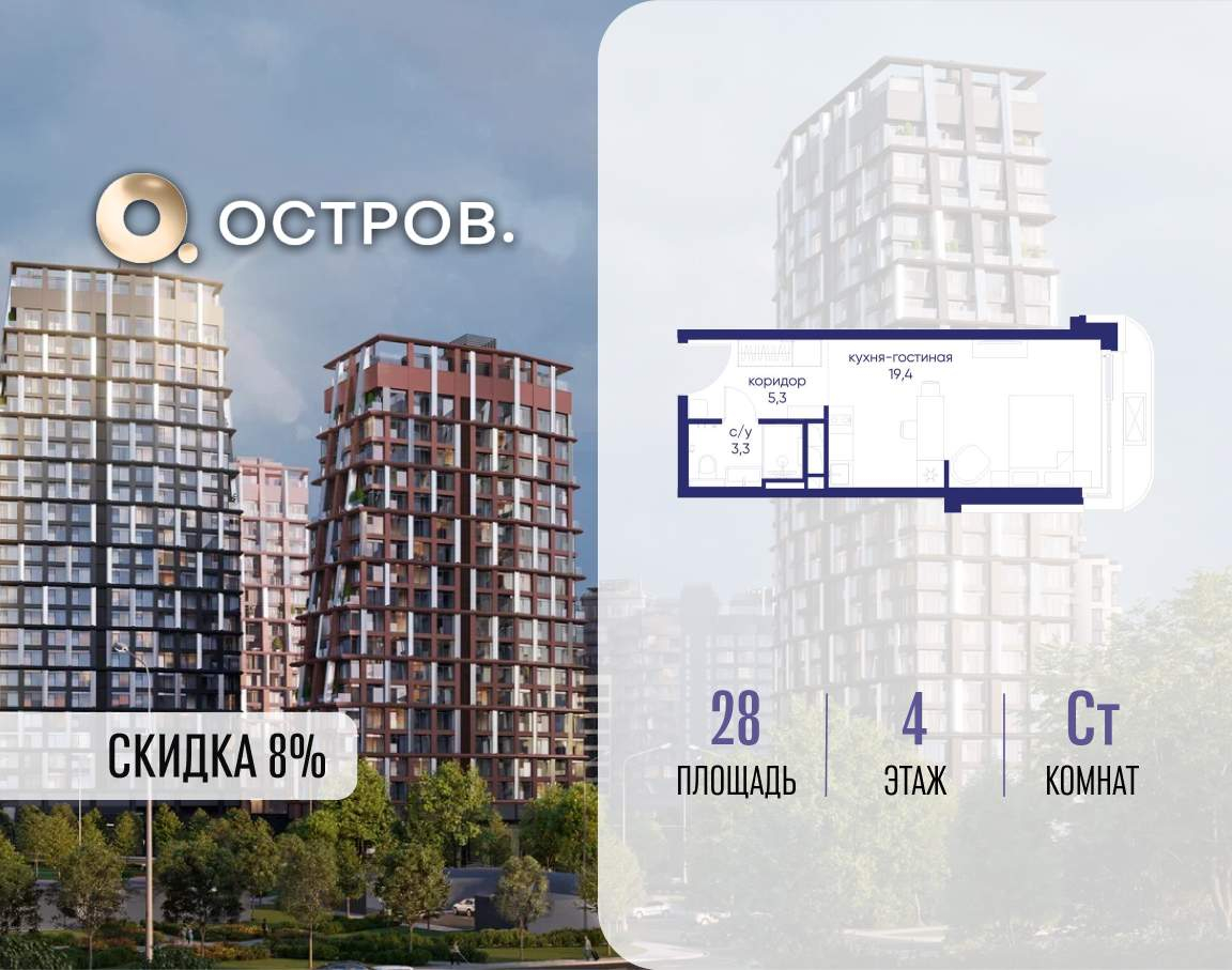 Продаётся квартира от застройщика: общая площадь 28.00 м, жилая 14.40 м, кухня 5.00 м, 4-й этаж, жилой квартал «Остров 14», корпус 1 (секция 1) . Срок сдачи: 2 квартал 2029 года.
