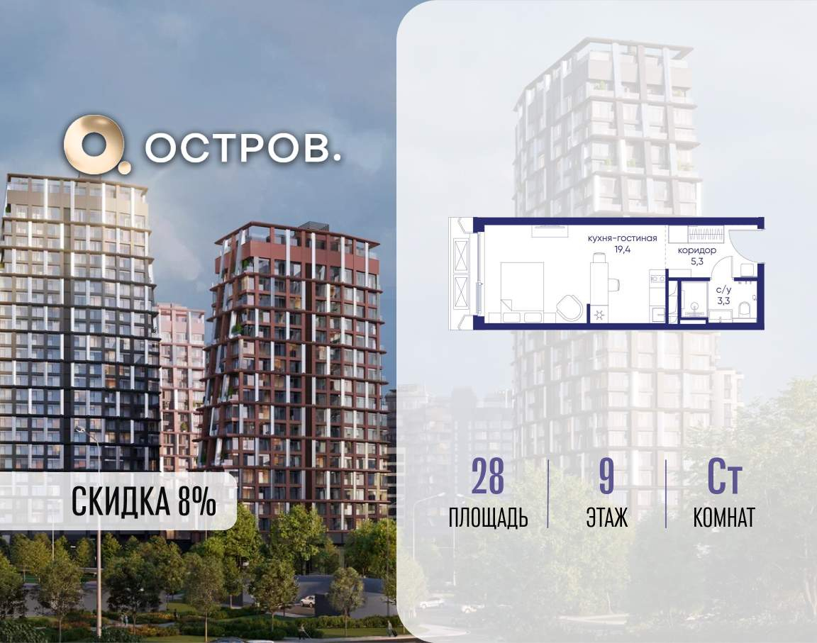 Продаётся квартира от застройщика: общая площадь 28.00 м, жилая 14.40 м, кухня 5.00 м, 9-й этаж, жилой квартал «Остров 14», корпус 1 (секция 2) . Срок сдачи: 2 квартал 2029 года.