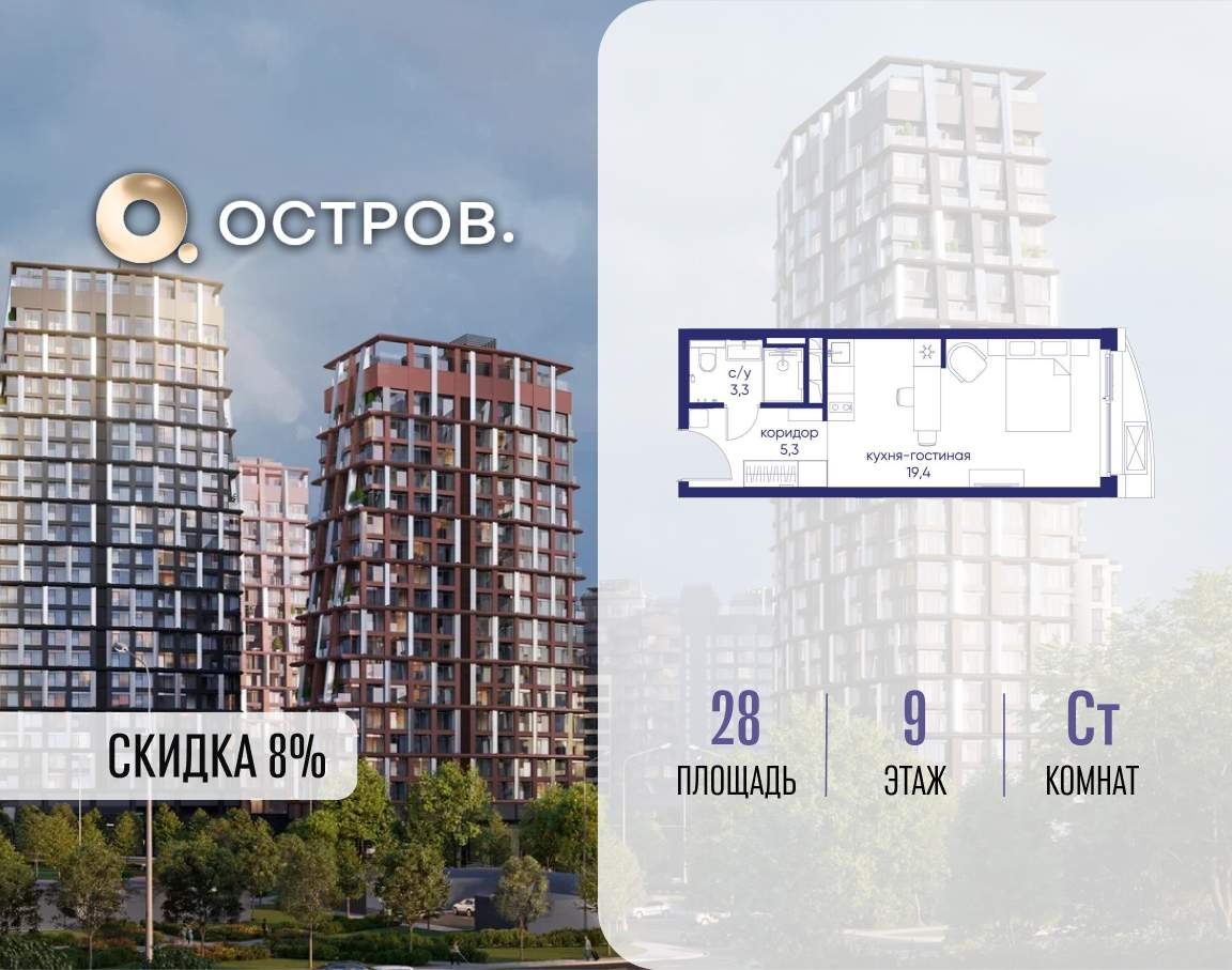Продаётся квартира от застройщика: общая площадь 28.00 м, жилая 14.40 м, кухня 5.00 м, 9-й этаж, жилой квартал «Остров 14», корпус 1 (секция 1) . Срок сдачи: 2 квартал 2029 года.
