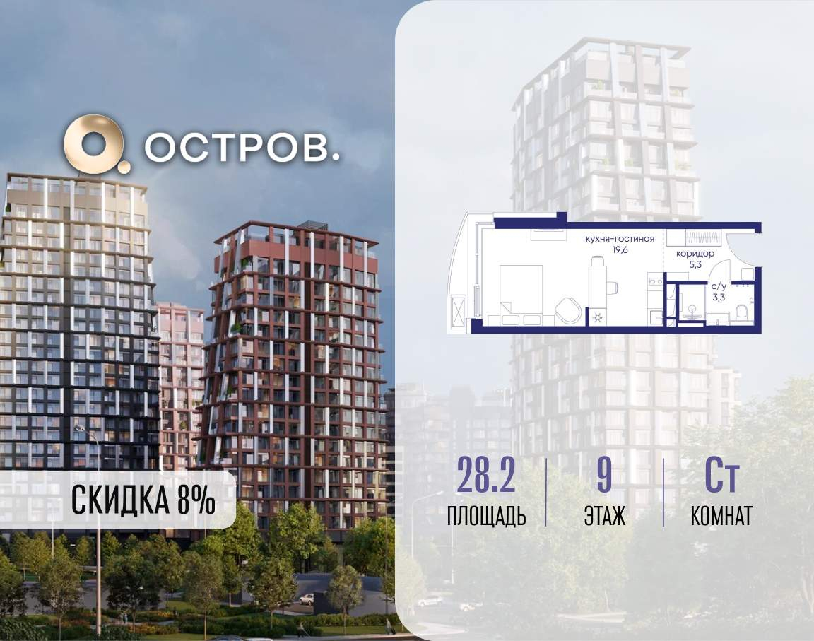 Продаётся квартира от застройщика: общая площадь 28.20 м, жилая 14.60 м, кухня 5.00 м, 9-й этаж, жилой квартал «Остров 14», корпус 1 (секция 1) . Срок сдачи: 2 квартал 2029 года.