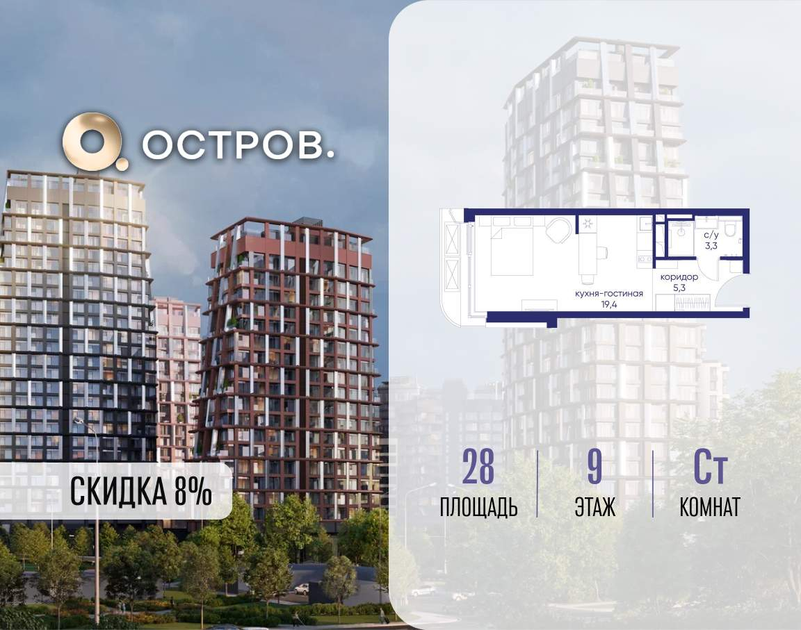 Продаётся квартира от застройщика: общая площадь 28.00 м, жилая 14.40 м, кухня 5.00 м, 9-й этаж, жилой квартал «Остров 14», корпус 1 (секция 1) . Срок сдачи: 2 квартал 2029 года.