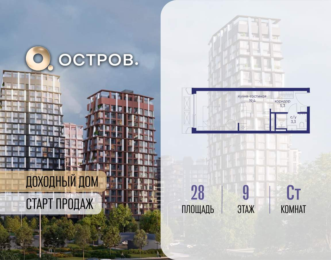 Продаётся квартира от застройщика: общая площадь 28.00 м, жилая 14.40 м, кухня 5.00 м, 9-й этаж, жилой квартал «Остров 14», корпус 1 (секция 1) . Срок сдачи: 2 квартал 2029 года.