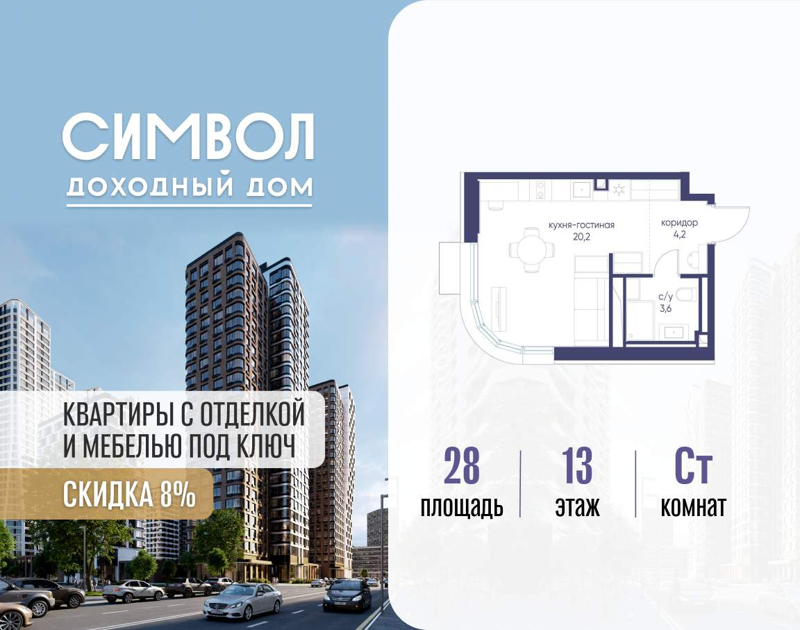 Продается квартира-студия от застройщика: общая площадь 28.00 м, жилая 15.20 м, кухня 5.00 м, 13-й этаж, жилой квартал «Гордость», корпус 40 (секция 1) . Срок сдачи: 2 квартал 2029 года.