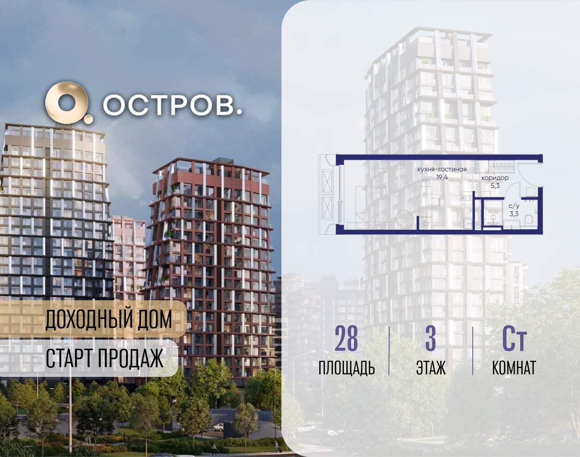 Продаётся квартира от застройщика: общая площадь 28.00 м, жилая 14.40 м, кухня 5.00 м, 3-й этаж, жилой квартал «Остров 14», корпус 1 (секция 1) . Срок сдачи: 2 квартал 2029 года.