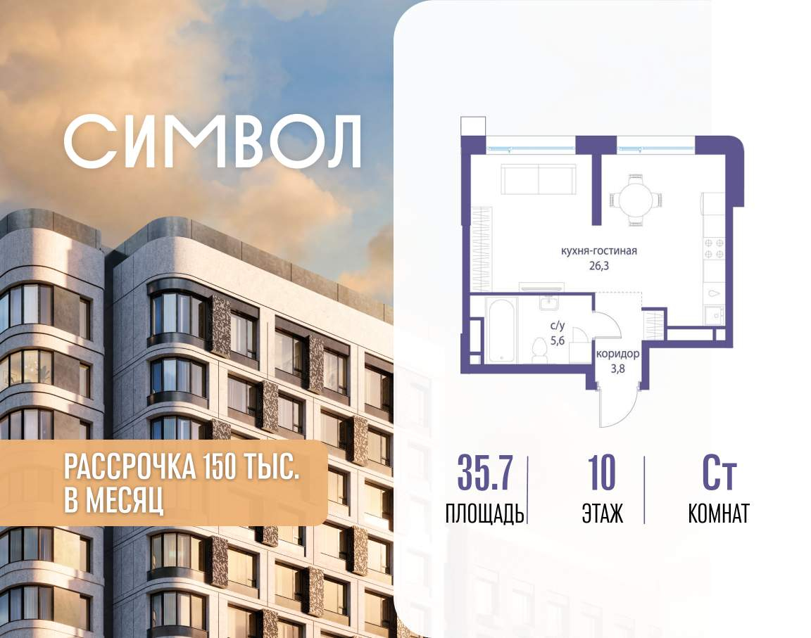 Продается квартира-студия от застройщика: общая площадь 35.70 м, жилая 20.00 м, кухня 6.30 м, 10-й этаж, жилой квартал «Гордость», корпус 36 (секция 3) . Срок сдачи: 2 квартал 2029 года.