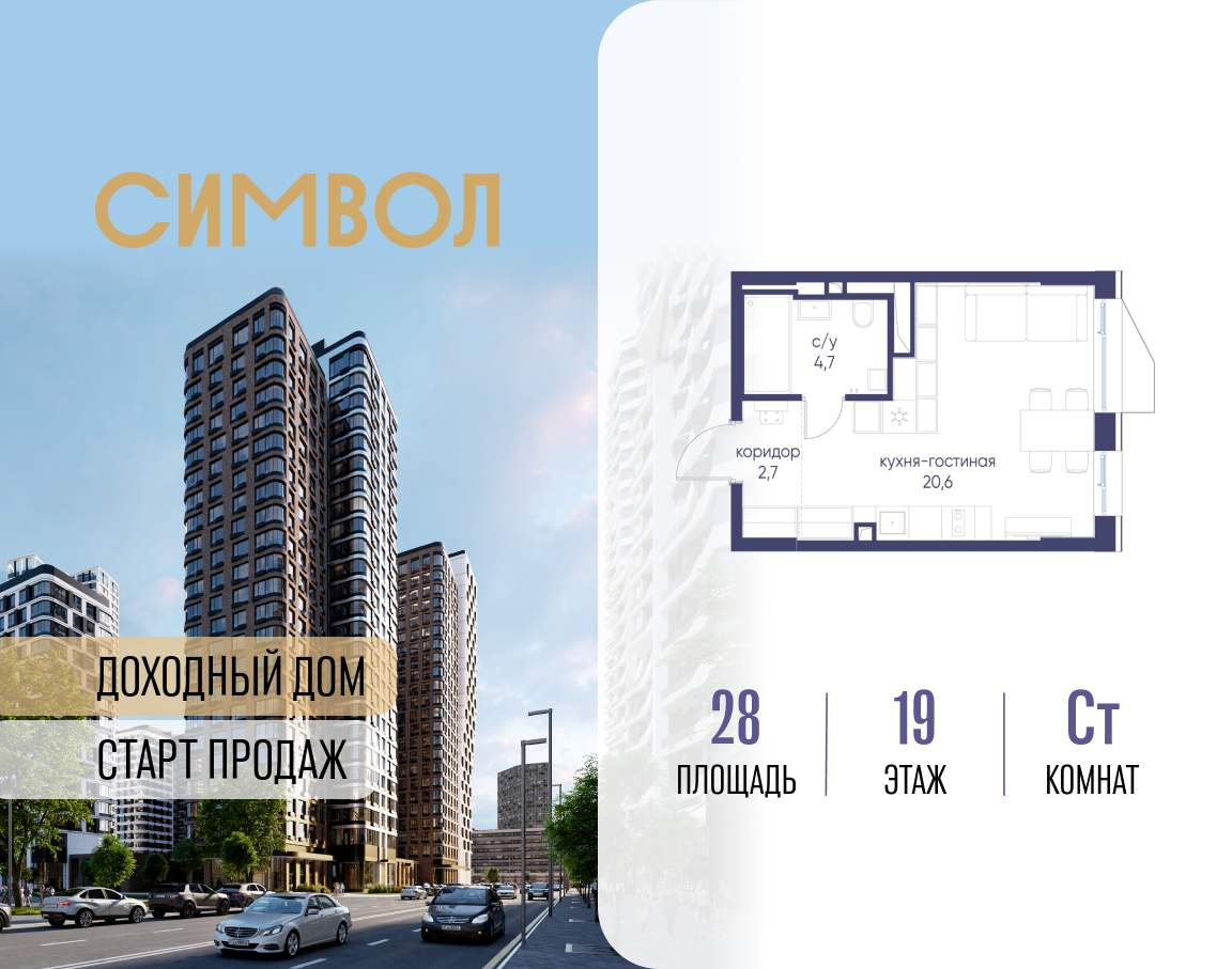 Продается квартира-студия от застройщика: общая площадь 28.00 м, жилая 16.60 м, кухня 5.00 м, 19-й этаж, жилой квартал «Гордость», корпус 40 (секция 1) . Срок сдачи: 2 квартал 2029 года.