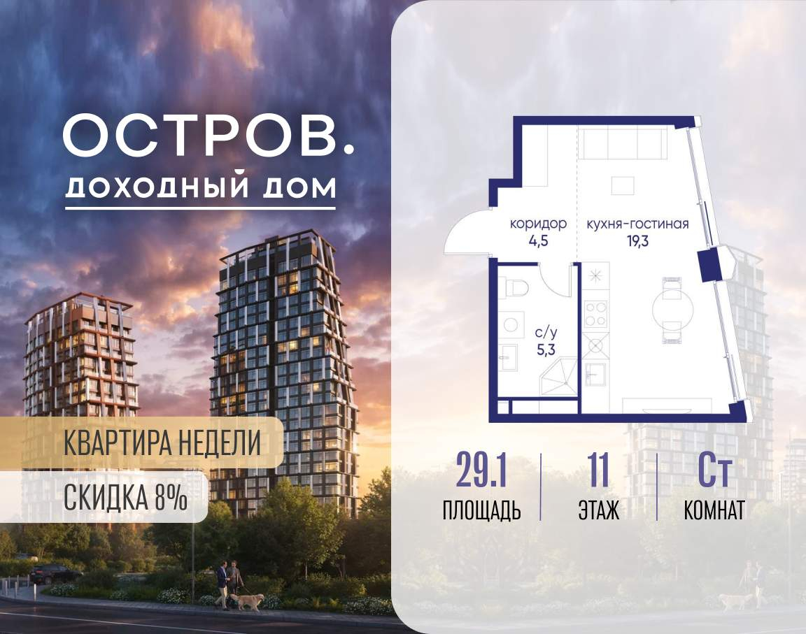 Продаётся квартира от застройщика: общая площадь 29.10 м, жилая 14.30 м, кухня 5.00 м, 11-й этаж, жилой квартал «Остров 14», корпус 6 (секция 1) . Срок сдачи: 2 квартал 2029 года.