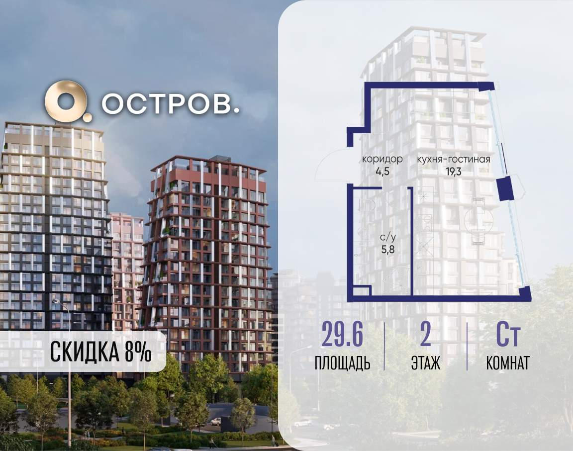 Продаётся квартира от застройщика: общая площадь 29.60 м, жилая 14.30 м, кухня 5.00 м, 2-й этаж, жилой квартал «Остров 14», корпус 6 (секция 1) . Срок сдачи: 2 квартал 2029 года.