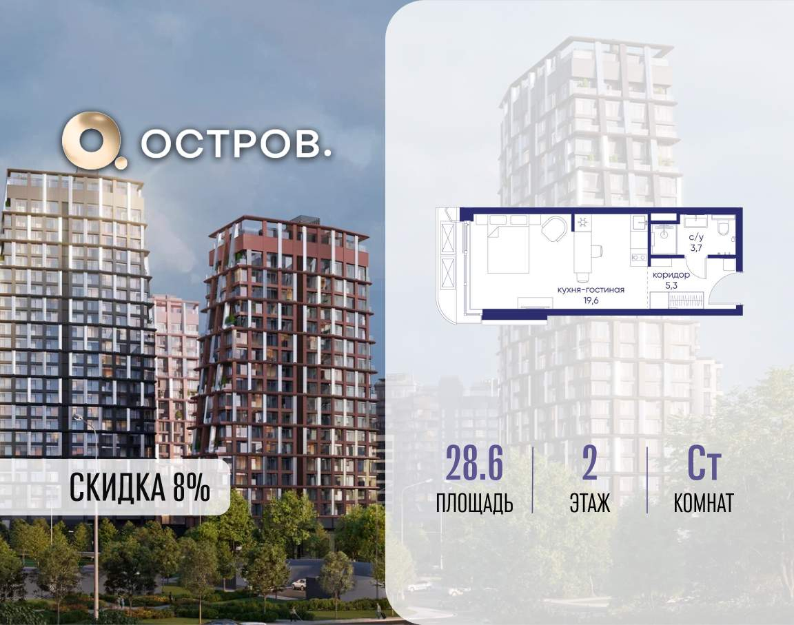 Продаётся квартира от застройщика: общая площадь 28.60 м, жилая 14.60 м, кухня 5.00 м, 2-й этаж, жилой квартал «Остров 14», корпус 1 (секция 2) . Срок сдачи: 2 квартал 2029 года.