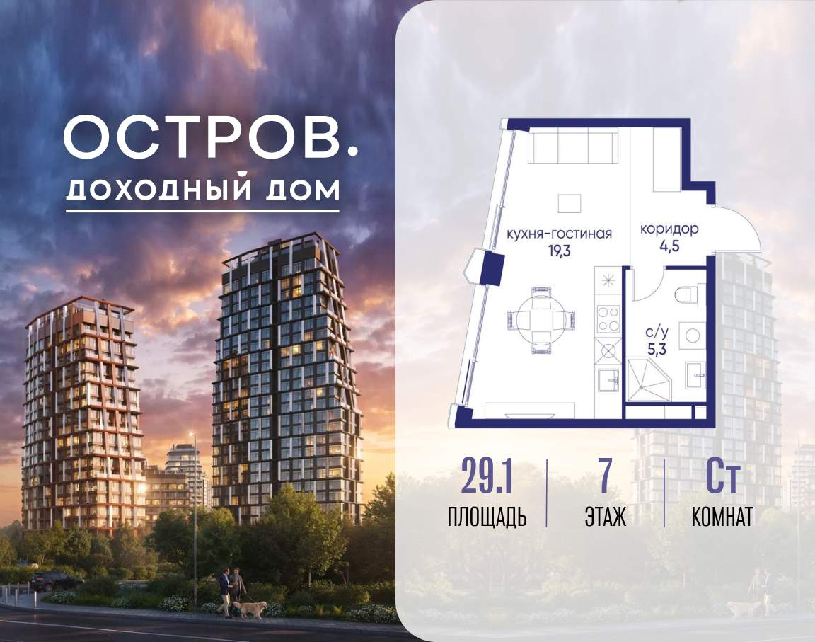 Продаётся квартира от застройщика: общая площадь 29.10 м, жилая 14.30 м, кухня 5.00 м, 7-й этаж, жилой квартал «Остров 14», корпус 4 (секция 1) . Срок сдачи: 2 квартал 2029 года.