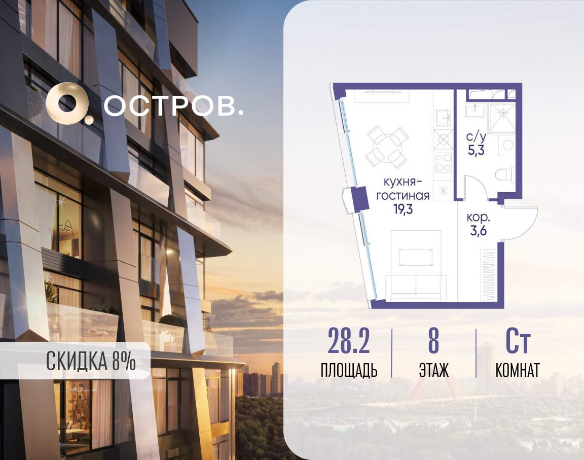 Продаётся квартира от застройщика: общая площадь 28.20 м, жилая 10.00 м, кухня 9.30 м, 8-й этаж, жилой квартал «Остров 12», корпус 3 (секция 1) . Срок сдачи: 1 квартал 2029 года.