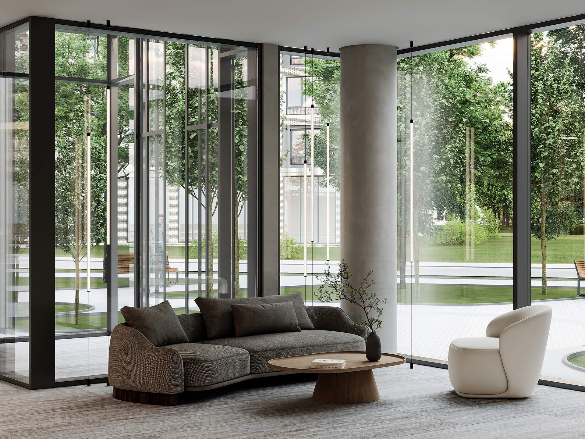 Большие окна во всей квартире наполняют комнаты естественным светом и делают солнце частью интерьера. Высокие потолки придают пространству ощущение свободы и лёгкости. Продуманная планировка позволяет эффективно использовать каждый квадратный метр.