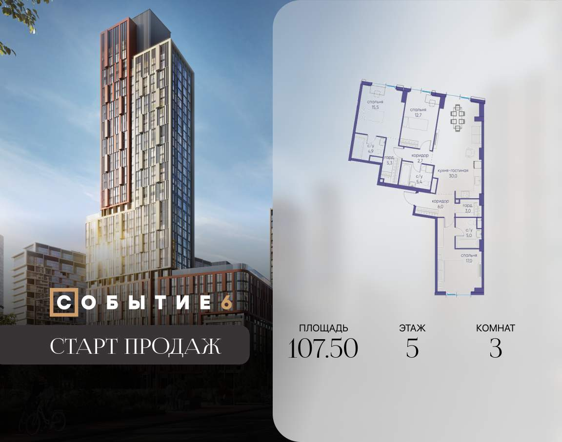 Продаётся 3-комнатная квартира от застройщика: общая площадь 107.50 м, жилая 35.20 м, кухня 30.00 м, 5-й этаж, жилой квартал «Событие-6», корпус 2 (секция 5) Срок сдачи: 1 квартал 2029 года.