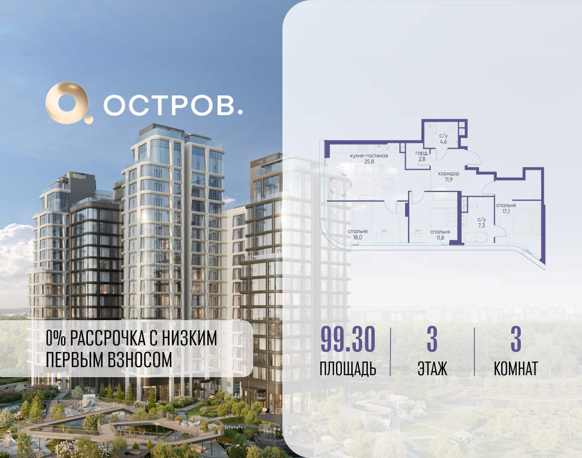 Продаётся 3-комн. квартира от застройщика: общая площадь 99.30 м, жилая 46.90 м, кухня 25.80 м, 3-й этаж, жилой квартал «Остров 12», корпус 6 (секция 1) . Срок сдачи: 1 квартал 2029 года.