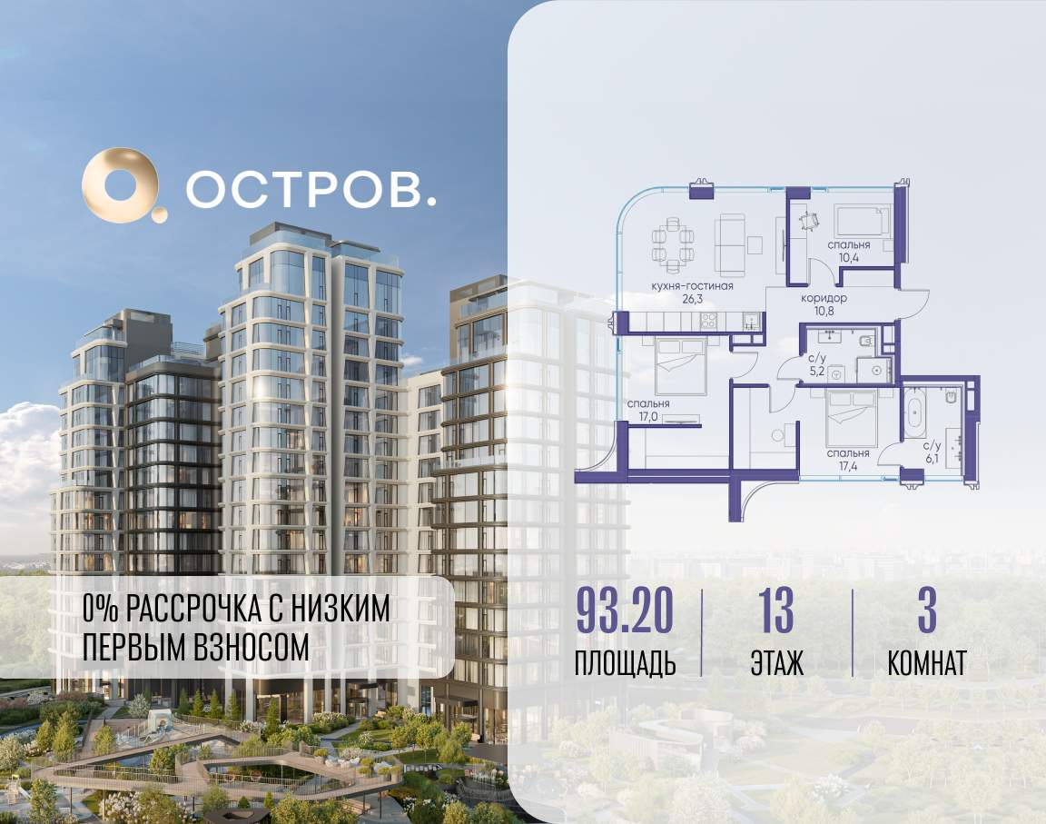 Продаётся 3-комн. квартира от застройщика: общая площадь 93.20 м, жилая 44.80 м, кухня 26.30 м, 13-й этаж, жилой квартал «Остров 12», корпус 2 (секция 2) . Срок сдачи: 1 квартал 2029 года.