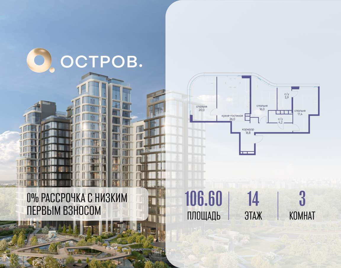 Продаётся 3-комн. квартира от застройщика: общая площадь 106.60 м, жилая 53.40 м, кухня 26.00 м, 14-й этаж, жилой квартал «Остров 12», корпус 6 (секция 1) . Срок сдачи: 1 квартал 2029 года.