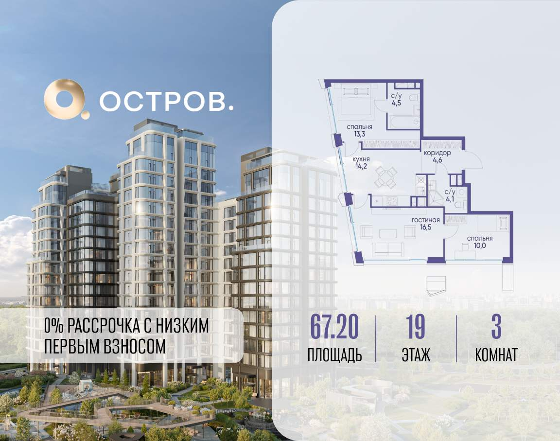 Продаётся 3-комн. квартира от застройщика: общая площадь 67.20 м, жилая 39.80 м, кухня 14.20 м, 19-й этаж, жилой квартал «Остров 12», корпус 3 (секция 1) . Срок сдачи: 1 квартал 2029 года.
