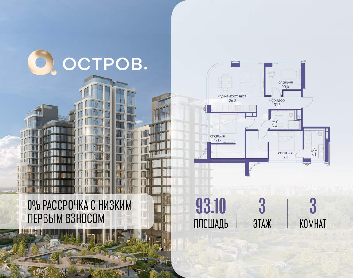 Продаётся 3-комн. квартира от застройщика: общая площадь 93.10 м, жилая 44.80 м, кухня 26.20 м, 3-й этаж, жилой квартал «Остров 12», корпус 2 (секция 2) . Срок сдачи: 1 квартал 2029 года.