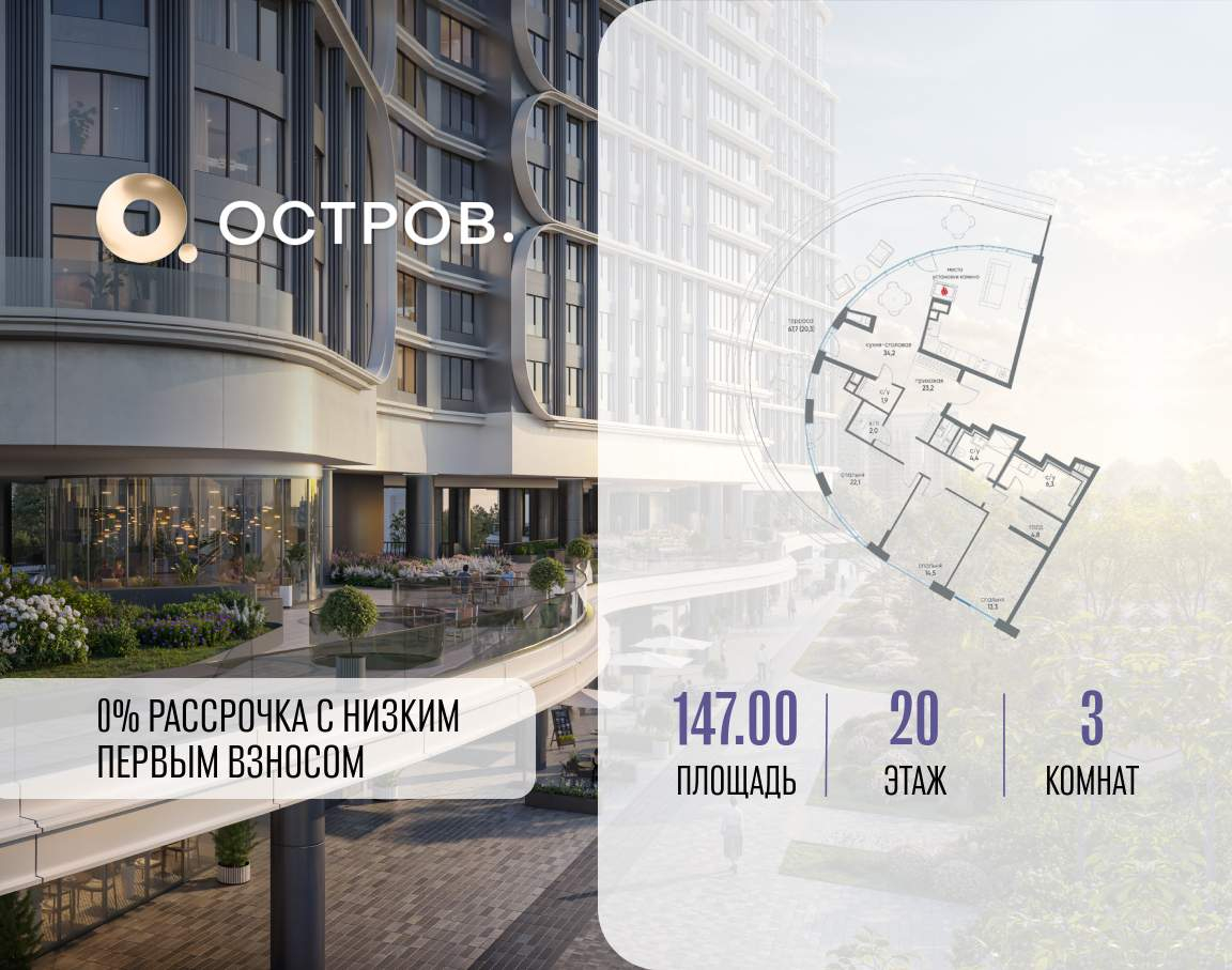 Продаётся 3-комн. квартира от застройщика: общая площадь 147.00 м, жилая 49.90 м, кухня 34.20 м, 20-й этаж, жилой квартал «Остров 7», корпус 7 (секция 1) . Срок сдачи: 3 квартал 2028 года.