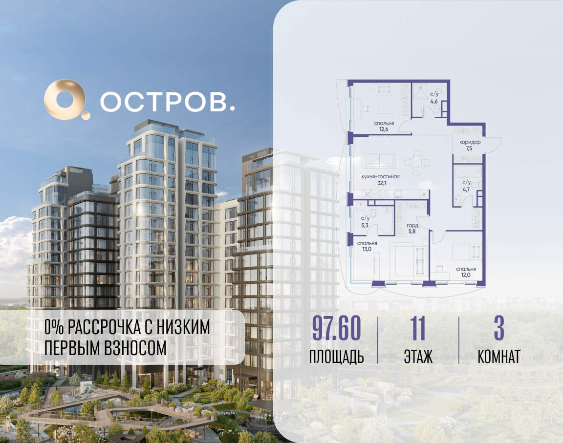Продаётся 3-комн. квартира от застройщика: общая площадь 97.60 м, жилая 37.60 м, кухня 32.10 м, 11-й этаж, жилой квартал «Остров 12», корпус 4 (секция 1) . Срок сдачи: 1 квартал 2029 года.