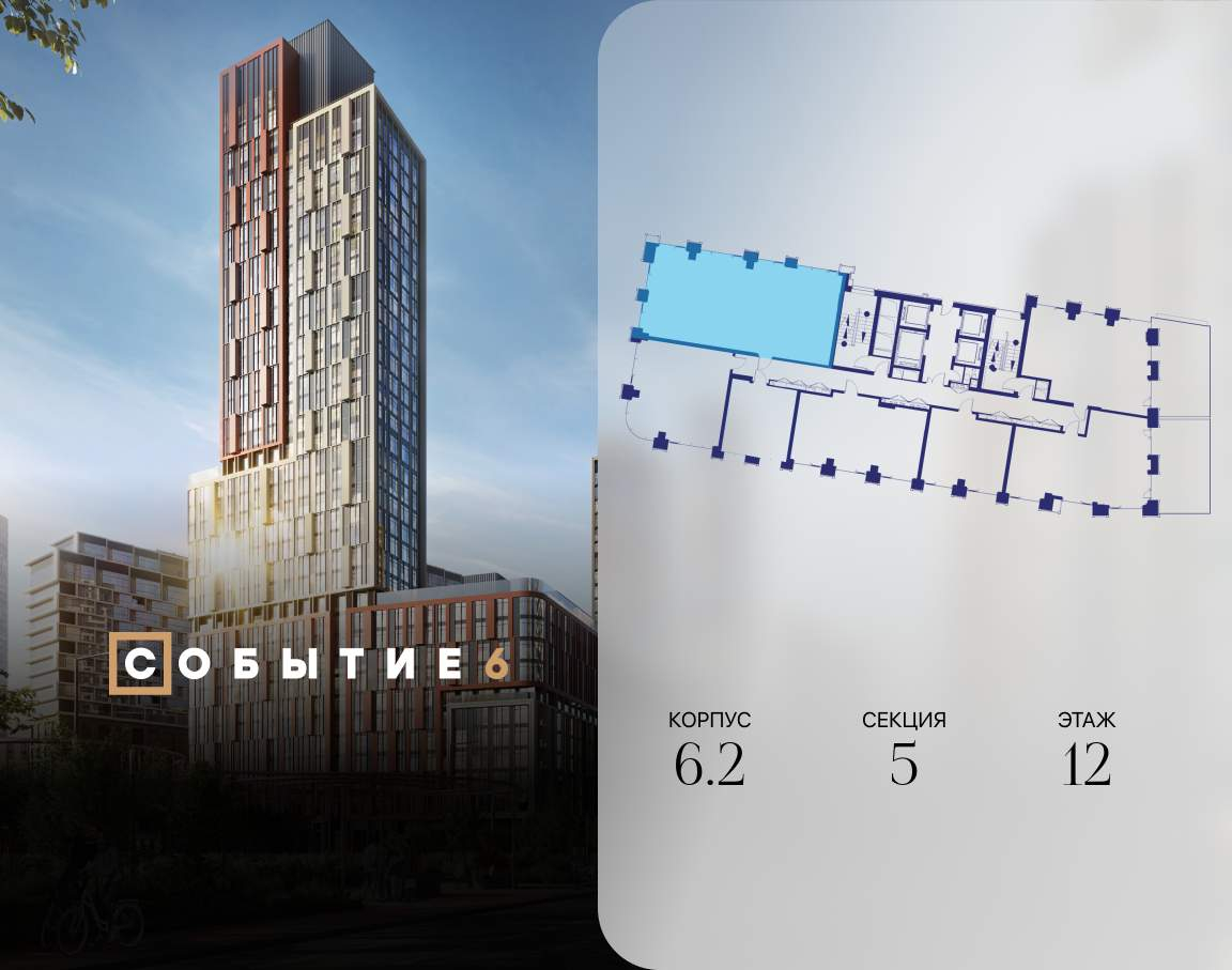 Продаётся 3-комнатная квартира от застройщика: общая площадь 114.20 м, жилая 56.50 м, кухня 27.40 м, 12-й этаж, жилой квартал «Событие-6», корпус 2 (секция 5) Срок сдачи: 1 квартал 2029 года.