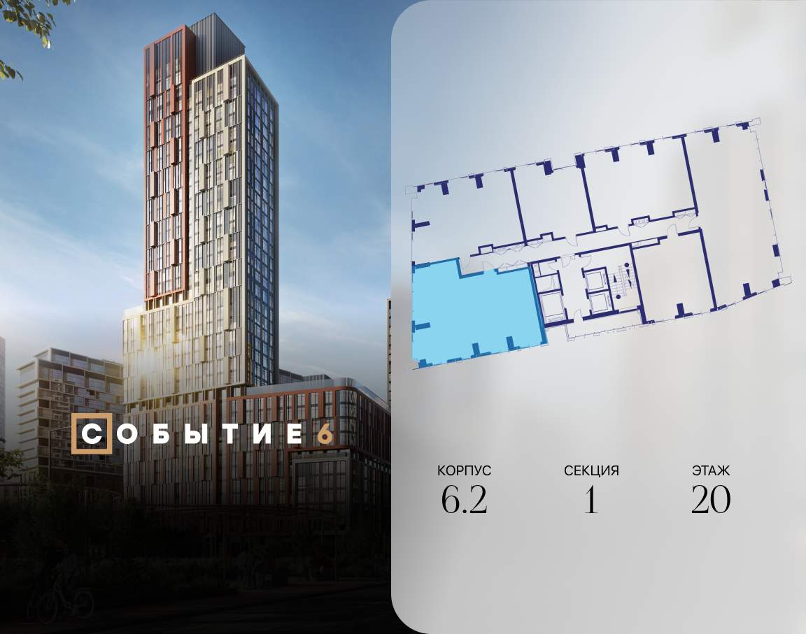 Продаётся 3-комнатная квартира от застройщика: общая площадь 99.70 м, жилая 42.00 м, кухня 23.20 м, 20-й этаж, жилой квартал «Событие-6», корпус 2 (секция 1) Срок сдачи: 1 квартал 2029 года.