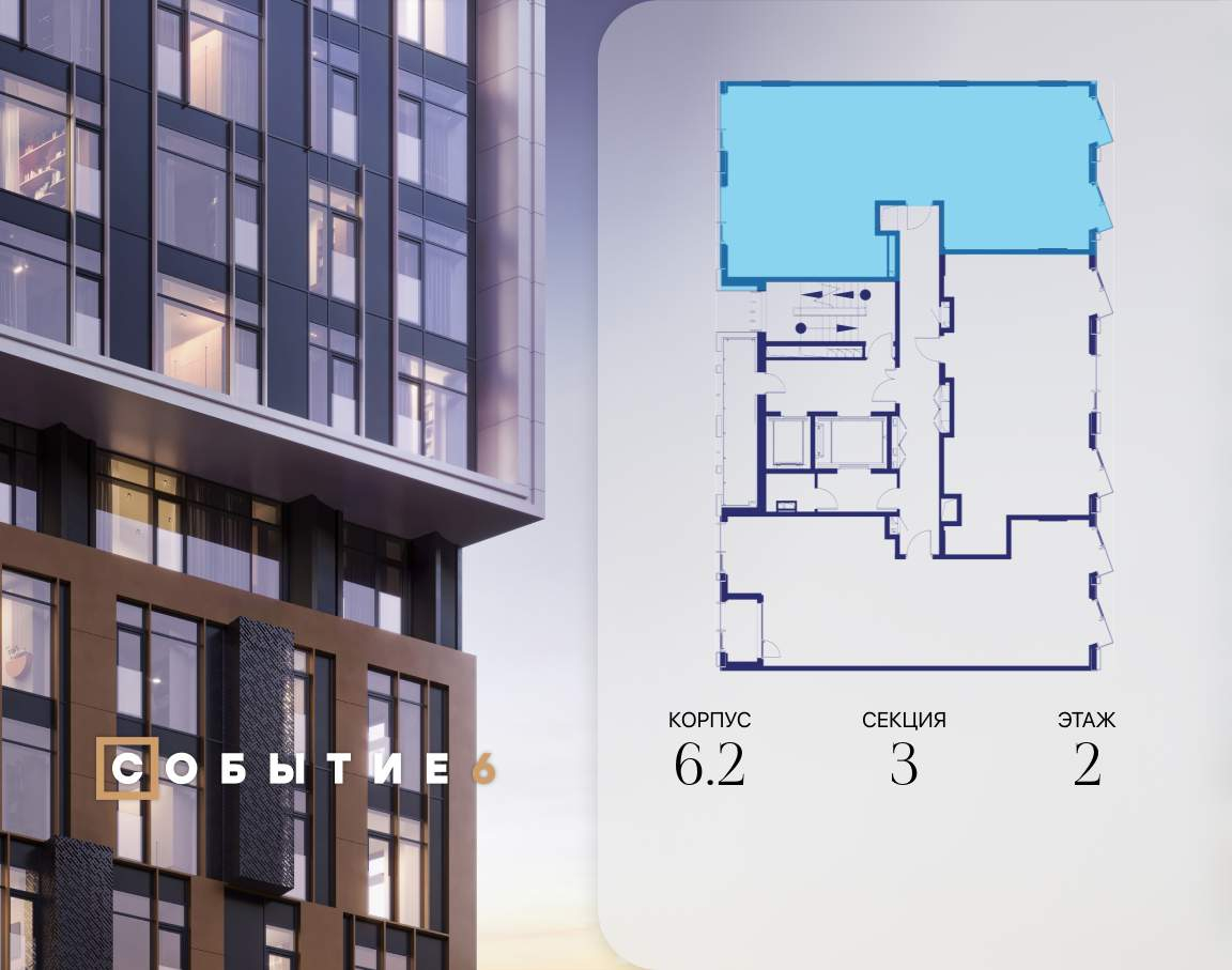 Продаётся 3-комнатная квартира от застройщика: общая площадь 104.50 м, жилая 43.70 м, кухня 29.00 м, 2-й этаж, жилой квартал «Событие-6», корпус 2 (секция 3) Срок сдачи: 4 квартал 2029 года.