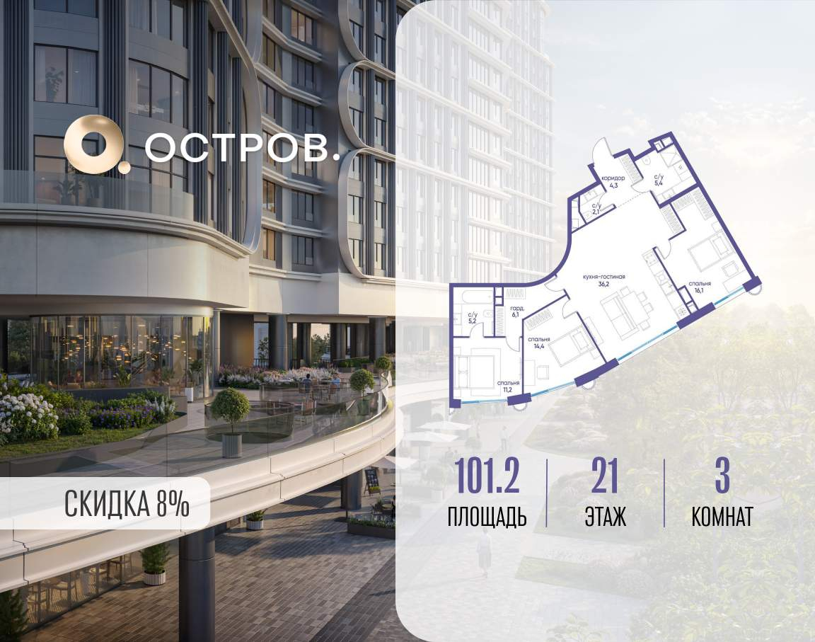 ОСТРОВ от Донстрой - жилой комплекс на западе Москвы, в Мневниковской пойме. Уникальное преимущество комплекса - в том, что он обособлен от города рекой и природным парком (650 га) . Благодаря природному окружению эта территория имеет лучший экологический рейтинг в столице. Кварталы ОСТРОВА объединены ландшафтным дизайном в единое пространство - с набережными и Центральным бульваром. На ОСТРОВЕ любые объекты, необходимые для полноценной жизни и отдыха, находятся на расстоянии 15-минутной прогулки. Торговый центр и супермаркеты, кафе и рестораны, фитнес, салоны красоты, школы и детские сады. А также крупнейший в Москве спортивный кластер.
