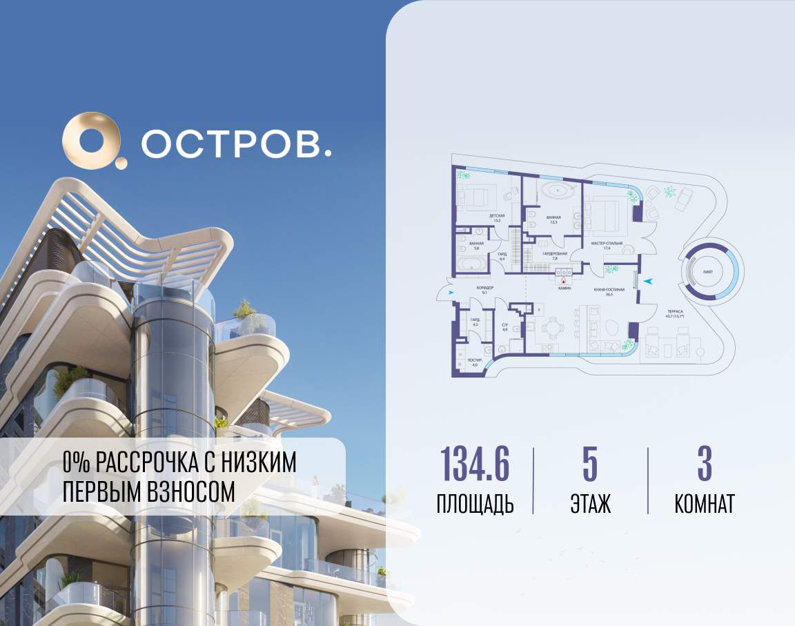 Продаётся 3-комн. квартира от застройщика: общая площадь 134.60 м, жилая 30.60 м, кухня 36.30 м, 5-й этаж, жилой квартал «Остров 10», (секция 1) . Срок сдачи: 2 квартал 2026 года.