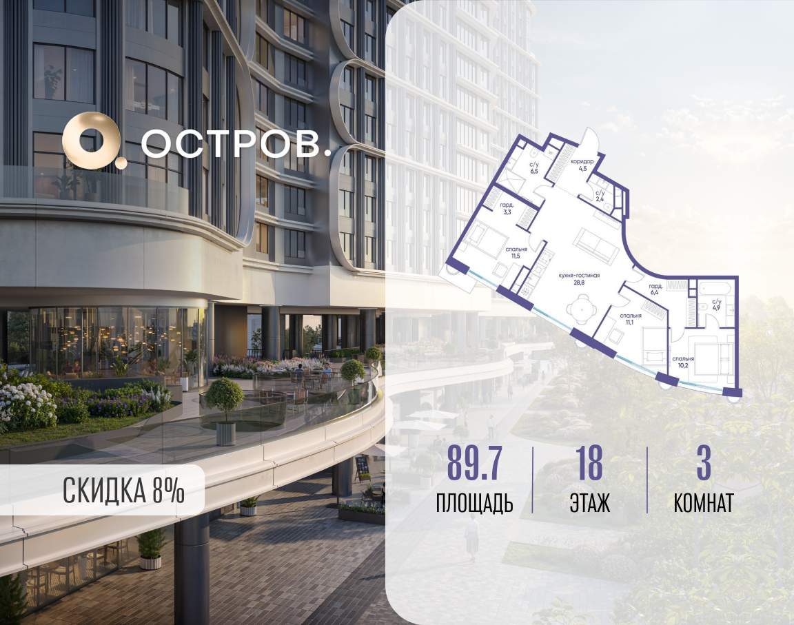 Продаётся 3-комн. квартира от застройщика: общая площадь 89.70 м, жилая 32.80 м, кухня 28.80 м, 18-й этаж, жилой квартал «Остров 7», корпус 7 (секция 2) . Срок сдачи: 3 квартал 2028 года.