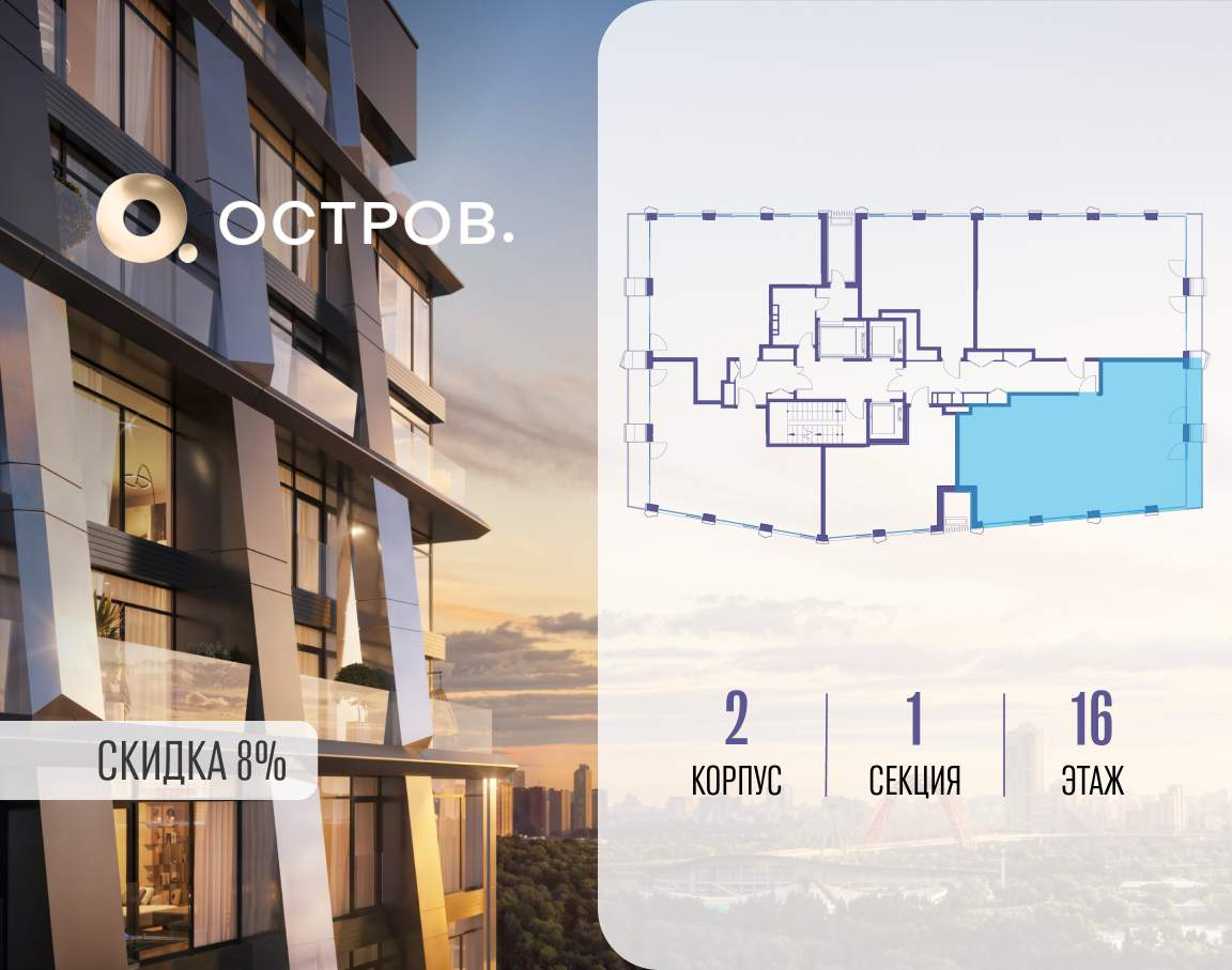 ОСТРОВ от Донстрой - жилой комплекс на западе Москвы, в Мневниковской пойме. Уникальное преимущество комплекса - в том, что он обособлен от города рекой и природным парком (650 га) . Благодаря природному окружению эта территория имеет лучший экологический рейтинг в столице. Кварталы ОСТРОВА объединены ландшафтным дизайном в единое пространство - с набережными и Центральным бульваром. На ОСТРОВЕ любые объекты, необходимые для полноценной жизни и отдыха, находятся на расстоянии 15-минутной прогулки. Торговый центр и супермаркеты, кафе и рестораны, фитнес, салоны красоты, школы и детские сады. А также крупнейший в Москве спортивный кластер.