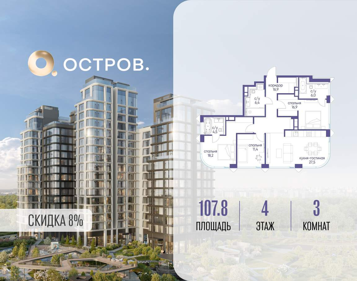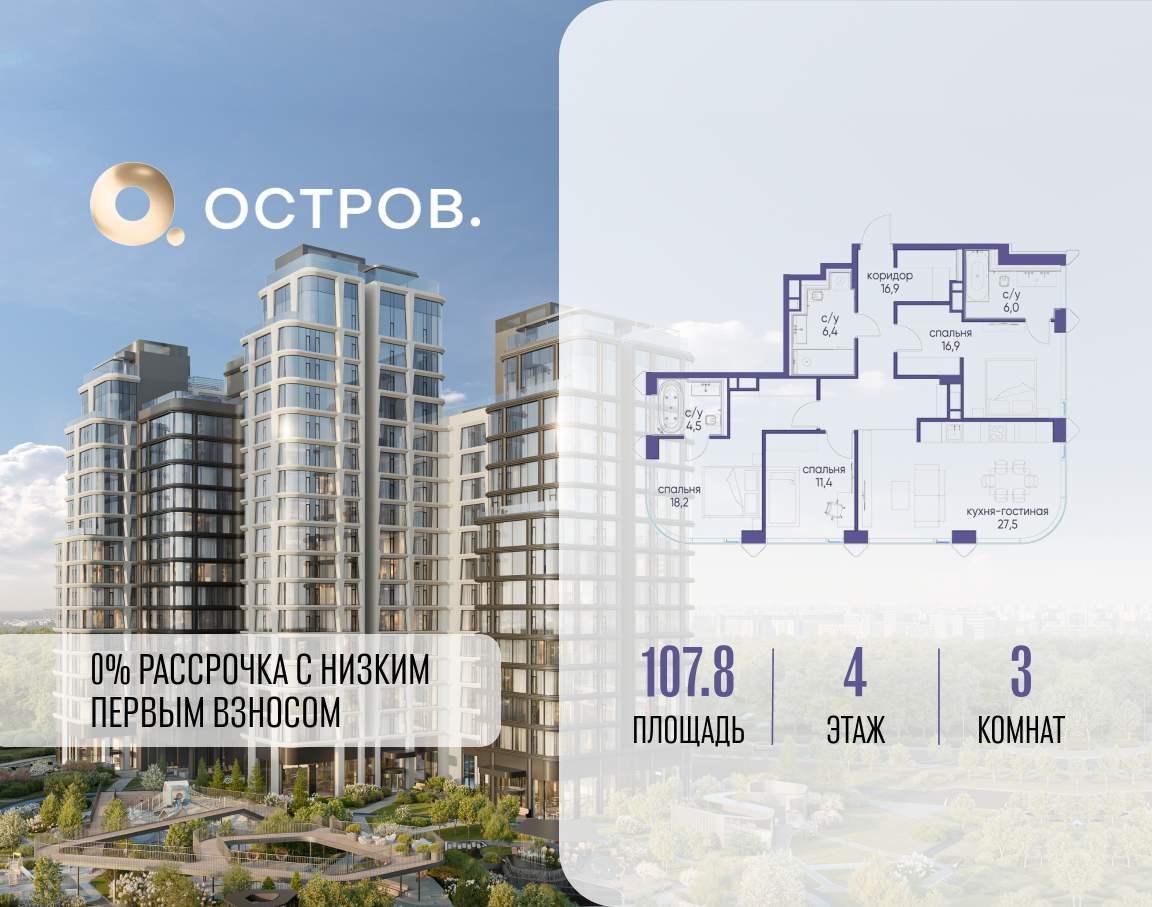 Продаётся 3-комн. квартира от застройщика: общая площадь 107.80 м, жилая 46.50 м, кухня 27.50 м, 4-й этаж, жилой квартал «Остров 12», корпус 2 (секция 2) . Срок сдачи: 1 квартал 2029 года.