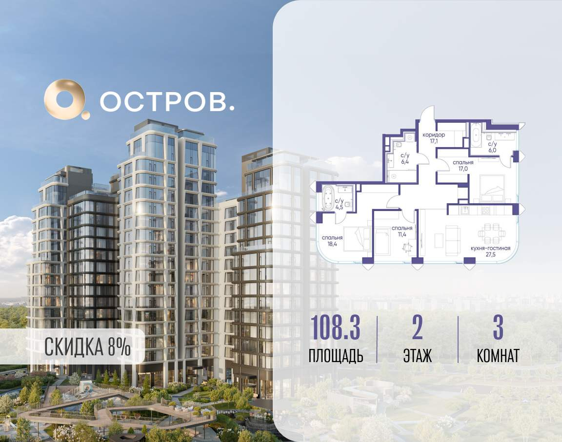 ОСТРОВ от Донстрой - жилой комплекс на западе Москвы, в Мневниковской пойме. Уникальное преимущество комплекса - в том, что он обособлен от города рекой и природным парком (650 га) . Благодаря природному окружению эта территория имеет лучший экологический рейтинг в столице. Кварталы ОСТРОВА объединены ландшафтным дизайном в единое пространство - с набережными и Центральным бульваром. На ОСТРОВЕ любые объекты, необходимые для полноценной жизни и отдыха, находятся на расстоянии 15-минутной прогулки. Торговый центр и супермаркеты, кафе и рестораны, фитнес, салоны красоты, школы и детские сады. А также крупнейший в Москве спортивный кластер.