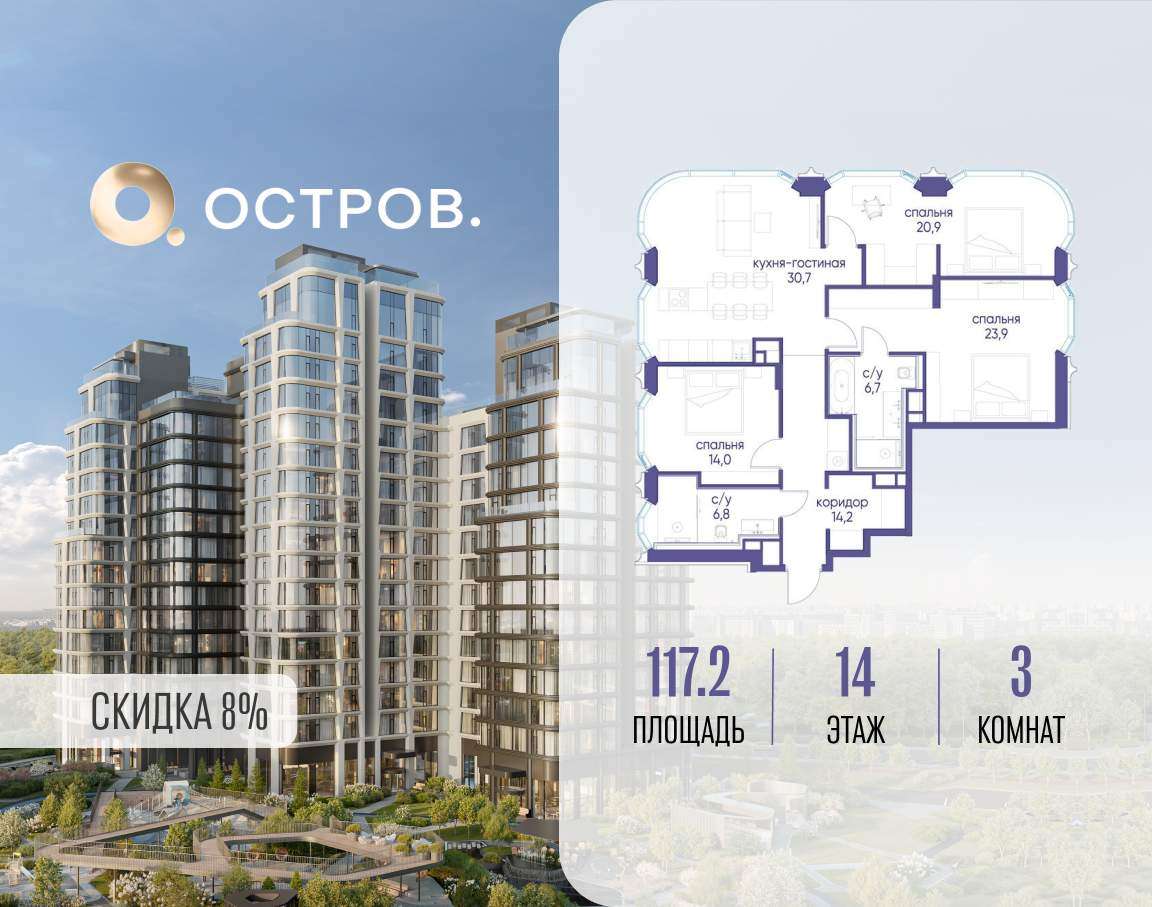 Продаётся 3-комн. квартира от застройщика: общая площадь 117.20 м, жилая 58.80 м, кухня 30.70 м, 14-й этаж, жилой квартал «Остров 12», корпус 2 (секция 1) . Срок сдачи: 1 квартал 2029 года.