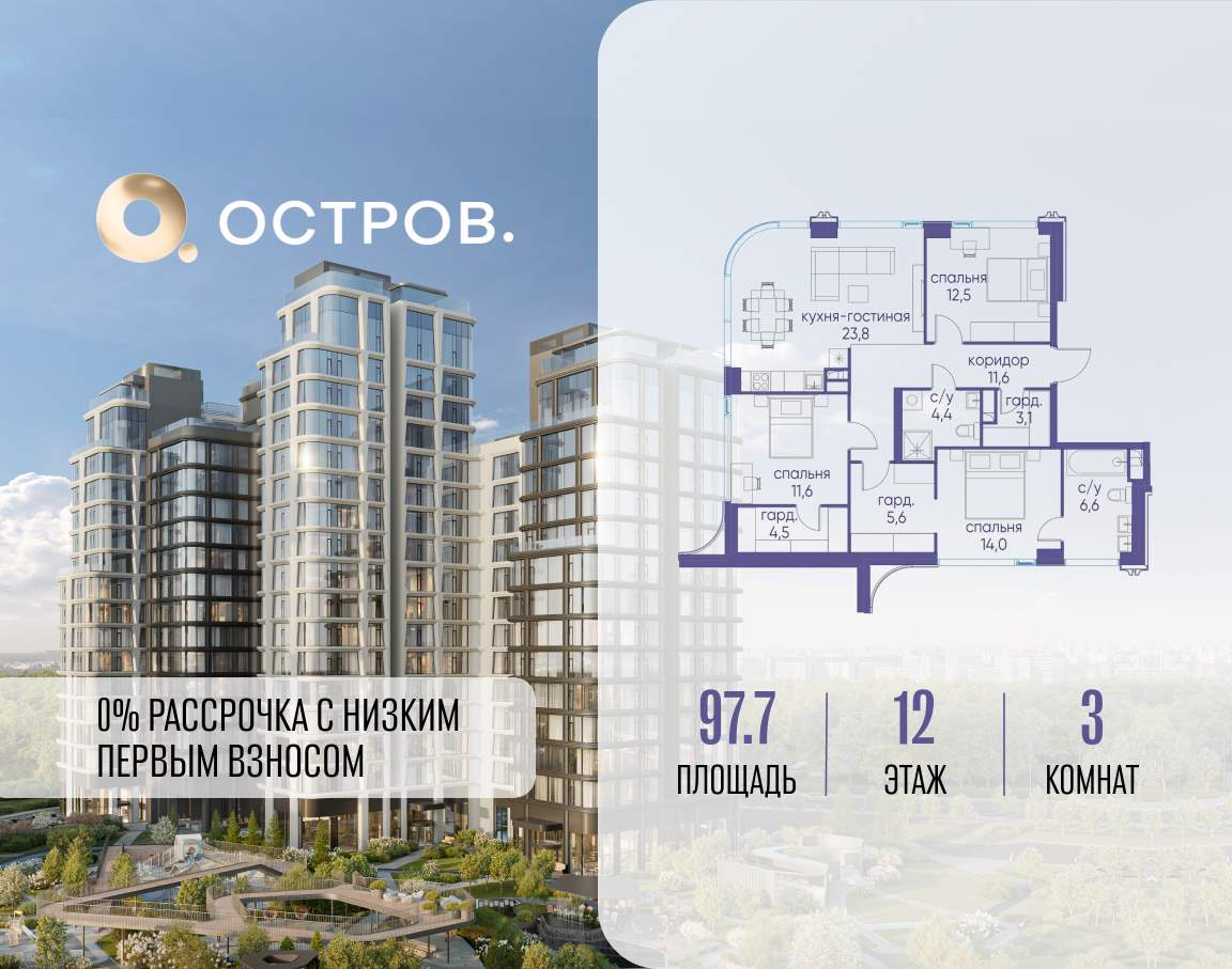 Продаётся 3-комн. квартира от застройщика: общая площадь 97.70 м, жилая 38.10 м, кухня 23.80 м, 12-й этаж, жилой квартал «Остров 12», корпус 1 (секция 2) . Срок сдачи: 1 квартал 2029 года.