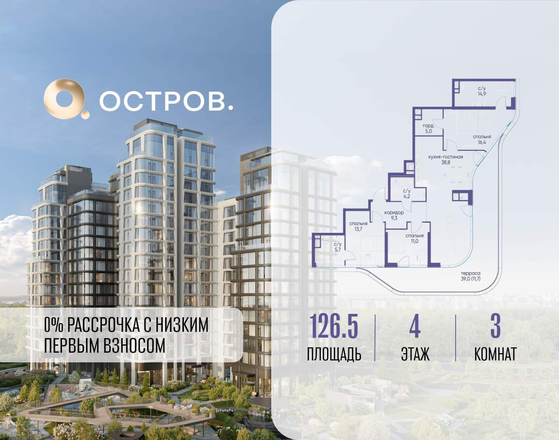 Продаётся 3-комн. квартира от застройщика: общая площадь 126.50 м, жилая 41.10 м, кухня 38.80 м, 4-й этаж, жилой квартал «Остров 12», корпус 6 (секция 1) . Срок сдачи: 1 квартал 2029 года.