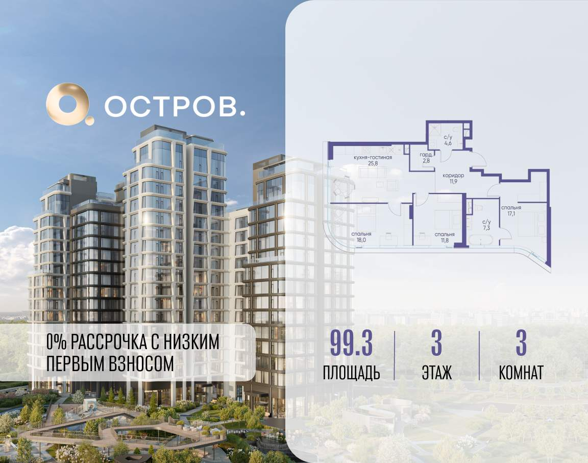 Продаётся 3-комн. квартира от застройщика: общая площадь 99.30 м, жилая 46.90 м, кухня 25.80 м, 3-й этаж, жилой квартал «Остров 12», корпус 6 (секция 1) . Срок сдачи: 1 квартал 2029 года.