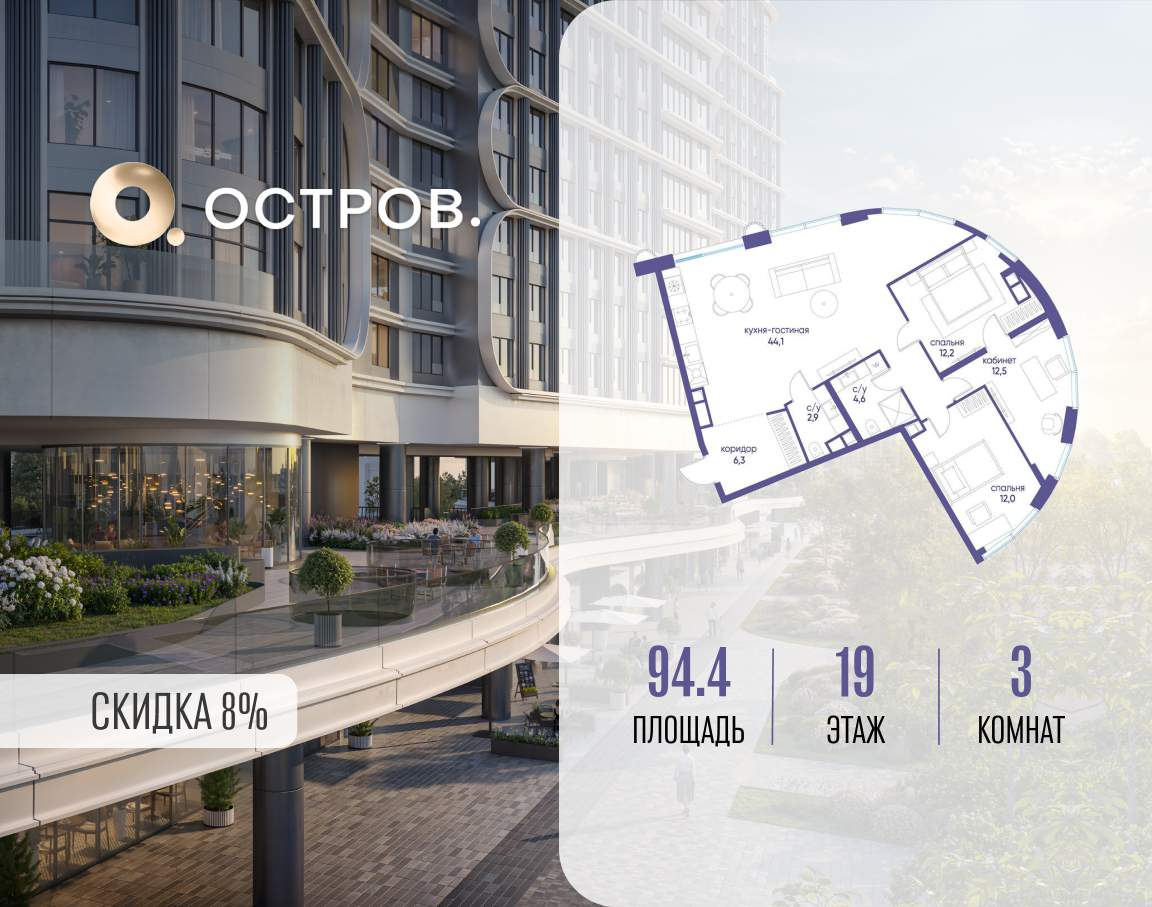 ОСТРОВ от Донстрой - жилой комплекс на западе Москвы, в Мневниковской пойме. Уникальное преимущество комплекса - в том, что он обособлен от города рекой и природным парком (650 га) . Благодаря природному окружению эта территория имеет лучший экологический рейтинг в столице. Кварталы ОСТРОВА объединены ландшафтным дизайном в единое пространство - с набережными и Центральным бульваром. На ОСТРОВЕ любые объекты, необходимые для полноценной жизни и отдыха, находятся на расстоянии 15-минутной прогулки. Торговый центр и супермаркеты, кафе и рестораны, фитнес, салоны красоты, школы и детские сады. А также крупнейший в Москве спортивный кластер.