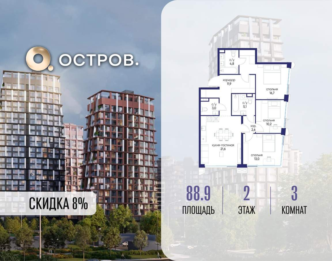 Продаётся 3-комн. квартира от застройщика: общая площадь 88.90 м, жилая 39.90 м, кухня 21.60 м, 2-й этаж, жилой квартал «Остров 14», корпус 6 (секция 1) . Срок сдачи: 2 квартал 2029 года.