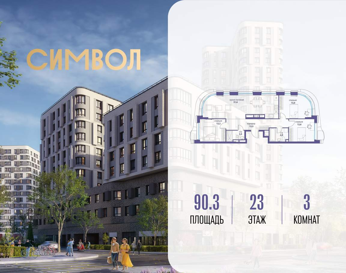 Продается 3-комнатная квартира от застройщика: общая площадь 90.30 м, жилая 37.80 м, кухня 31.60 м, 23-й этаж, жилой квартал «Вдохновение», корпус 34 (секция 1) . Срок сдачи: 4 квартал 2027 года.