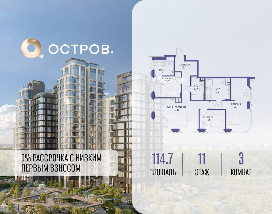 Продаётся 3-комн. квартира от застройщика: общая площадь 121.90 м, жилая 41.20 м, кухня 44.20 м, 20-й этаж, жилой квартал «Остров 7», корпус 7 (секция 2) . Срок сдачи: 3 квартал 2028 года.