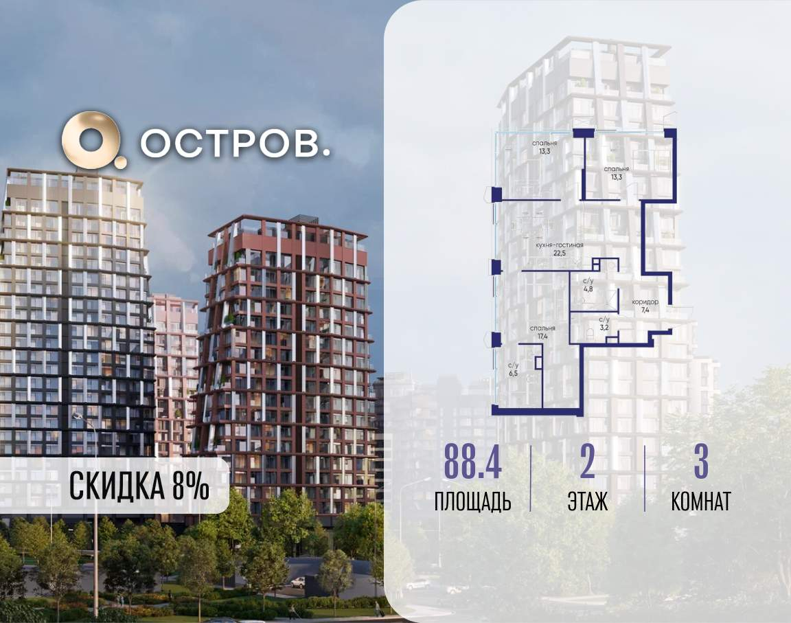 Продаётся 3-комн. квартира от застройщика: общая площадь 88.40 м, жилая 44.00 м, кухня 22.50 м, 2-й этаж, жилой квартал «Остров 14», корпус 6 (секция 1) . Срок сдачи: 2 квартал 2029 года.