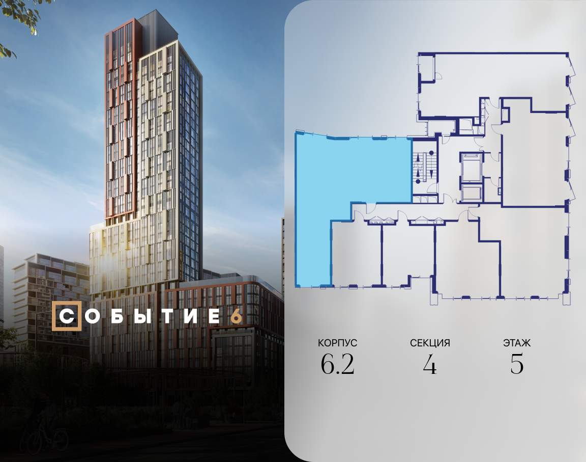 Продаётся 3-комнатная квартира от застройщика: общая площадь 108.90 м, жилая 42.40 м, кухня 23.30 м, 5-й этаж, жилой квартал «Событие-6», корпус 2 (секция 4) Срок сдачи: 1 квартал 2029 года.